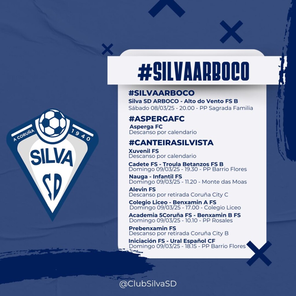 Tres de los equipos de la estructura de fútbol sala base de Silva SD ARBOCO afrontarán descanso por diferentes causas. Son el Juvenil FS, Alevin FS y Prebenjamin FS. Por su parte, el resto de equipos disfrutarán de competición oficial, concentrada el 9 de marzo en PP Barrio Flores, Monte das Moas, PP Rosales y Colegio Liceo.