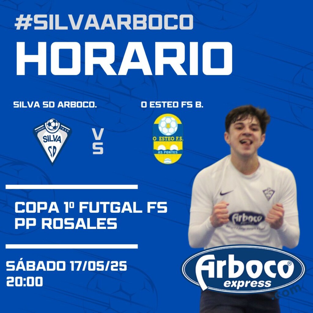 El partido de la eliminatoria de cuartos de final de la copa de 1ª Futgal FS, grupo 1º, entre Silva SD ARBOCO y O Esteo FS B B se disputará el sábado 17 de mayo del 2025 a partir de las 20.00 en las instalaciones de PP Rosales.