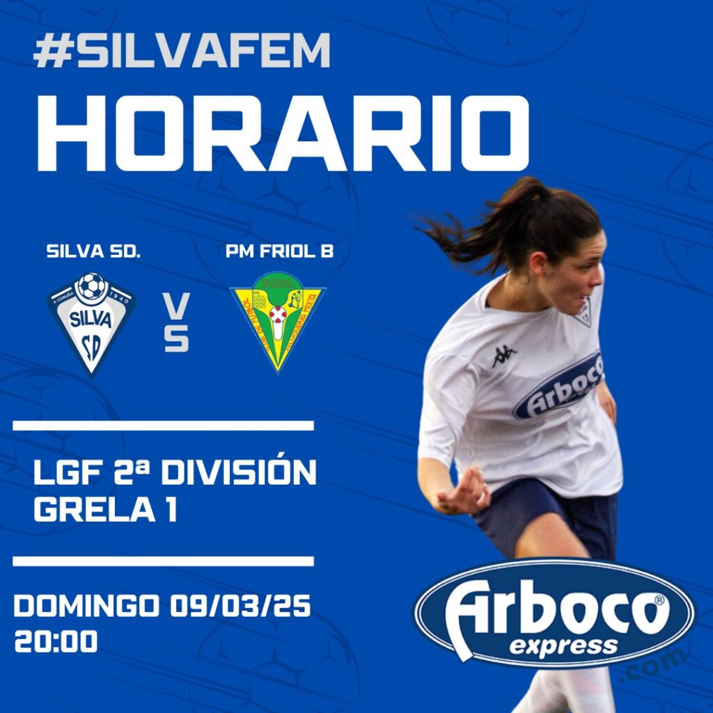 El partido de la 22ª jornada de LGF 2ª División, grupo 1º, entre Silva SD y PM Friol B se disputará el domingo 9 de marzo del 2025 a partir de las 20.00 en las instalaciones de Grela 1, con acceso gratuito en virtud de la ordenanza fiscal correspondiente.