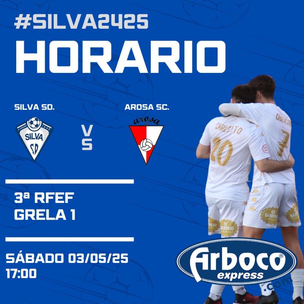 El partido de la 33ª jornada de 3ª RFEF, grupo 1º, entre Silva SD y Arosa SC se disputará el sábado 03 de mayo del 2025 a partir de las 17:00 en las instalaciones de Grela 1, con acceso gratuito en virtud de la ordenanza fiscal correspondiente. El aforo es de 924 butacas.