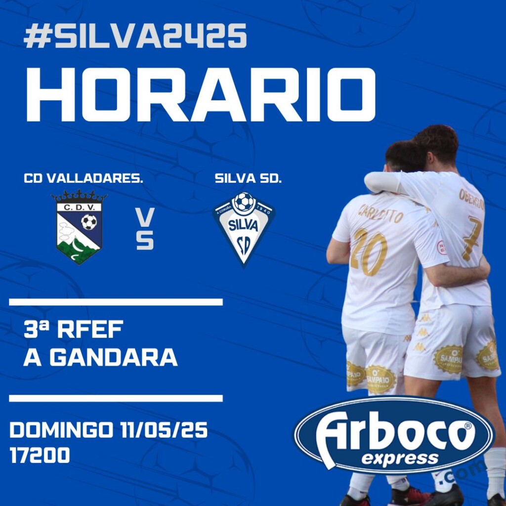 El partido de la 34ª jornada de 3ª RFEF, grupo 1º, entre CD Valladares y Silva SD se disputará el domingo 11 de mayo del 2025 a partir de las 12:00 en las instalaciones de A Gándara, en horario unificado, con acceso gratuito en virtud de la decisión extraordinaria adoptada por su junta directiva.