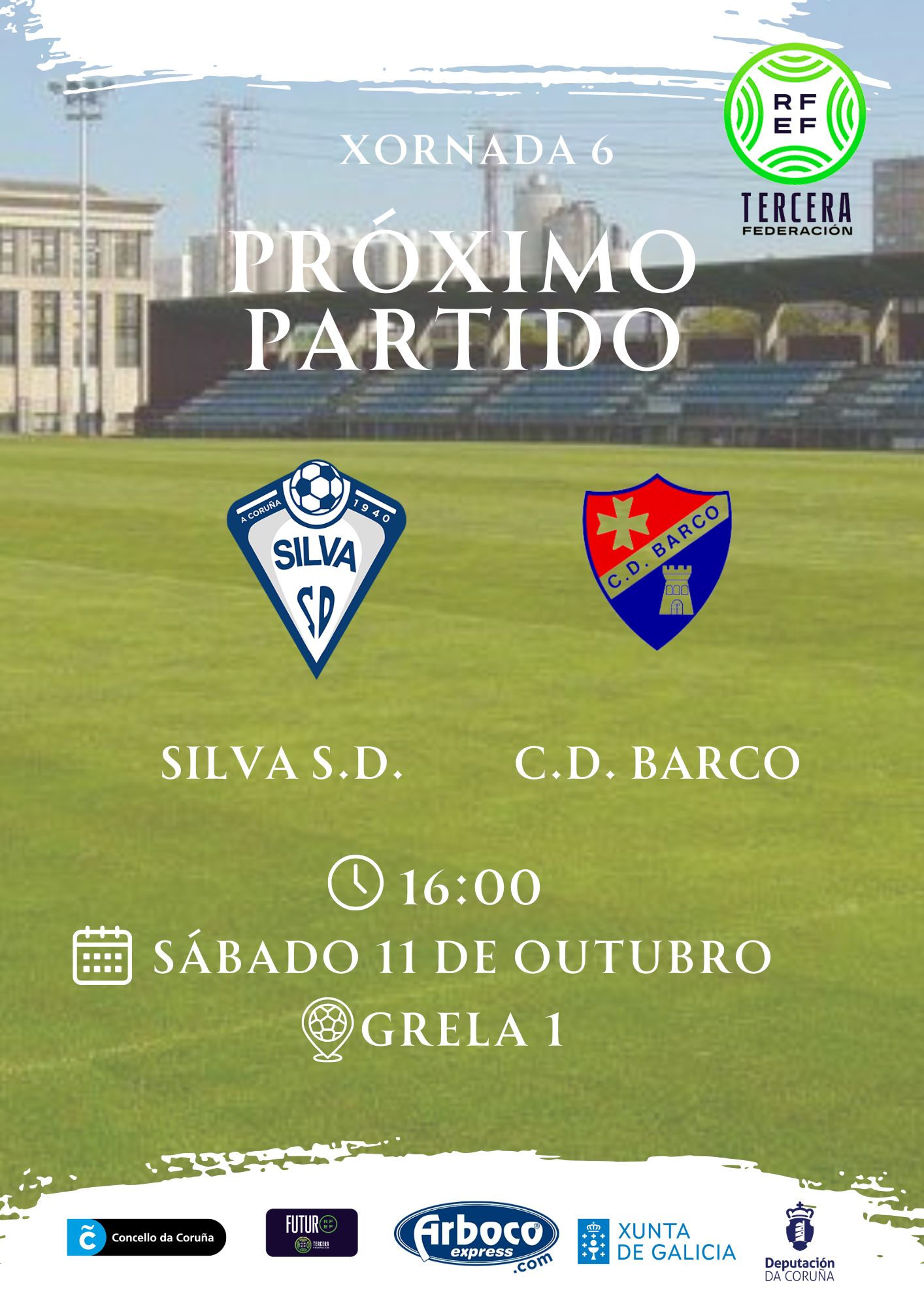 O partido da xornada 6ª de 3ª RFEF, grupo 1º, entre Silva SD e o CD Barco disputarase o sábado 11 de outubro do 2025 a partir das 16:00 nas instalación de Grela 1.