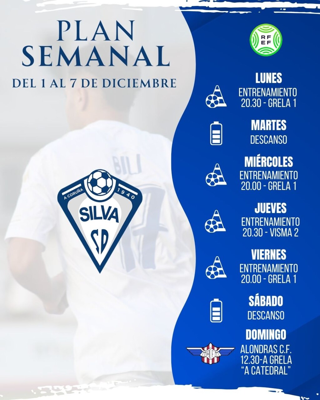 El 馃搷Silva S.D. inicia una nueva semana de preparaci贸n con un plan de trabajo dise帽ado para mantener el ritmo competitivo y llegar en las mejores condiciones al pr贸ximo compromiso liguero. El equipo combinar谩 sesiones de intensidad, trabajo t谩ctico y ejercicios espec铆ficos orientados a seguir consolidando la din谩mica del grupo.